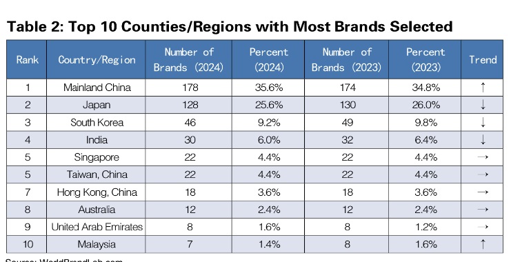 Наибольшим числом брендов представлен континентальный Китай — 178 из 500. Грубо говоря, каждый третий влиятельный азиатский бренд — китайский (континентальный). Примерно каждый четвертый (25,6%) — японский, что выводит Японию с 128 брендами на второе место в национальном рейтинге. Третье место — у Южной Кореи 46 брендов. В Топ-10 также вошли (в порядке убывания, в скобках указано число брендов): Индия (30), Сингапур и Тайвань (по 22, в КНР считают Тайвань частью Китая, на Тайване так не считают), Гонконг (18), Австралия (12), Объединенные Арабские Эмираты (8), Малайзия (7).