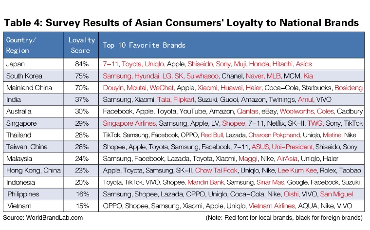 В Индии в десятку любимых вошли три индийских бренда: Tata, Flipkart, Amui. В Сингапуре тоже три — Singapore Airlines, Shopee, TWG. И в Таиланде три — местный Red Bull, Charoen Pokphand, Mistine. По два национальных бренда включили в десятку любимых жители Тайваня (ASUS, Uni-President), Малайзии (Maggi, Air Asia), Гонконга (Chow Tai Fook, Lee Kum Kee), Индонезии (Mandiri Bank, Sinar Mas), Филиппин (Oishi, San Miguel). Во Вьетнаме в Топ-10 любимых попал только один бренд — национальной авиакомпании Vietnam Airlines.