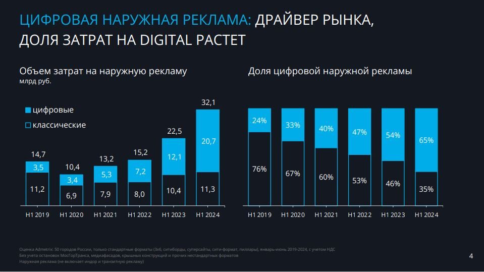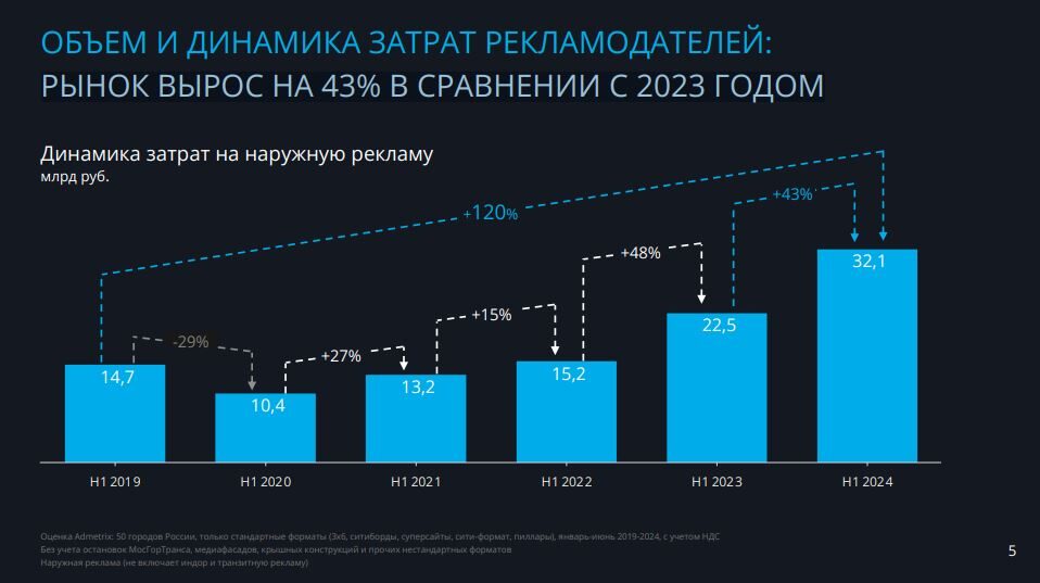 По данным Admetrix, рынок наружной рекламы в России по итогам первой половины 2024 года вырос на 43% относительно аналогичного периода 2023 года и достиг 32,1 млрд рублей.