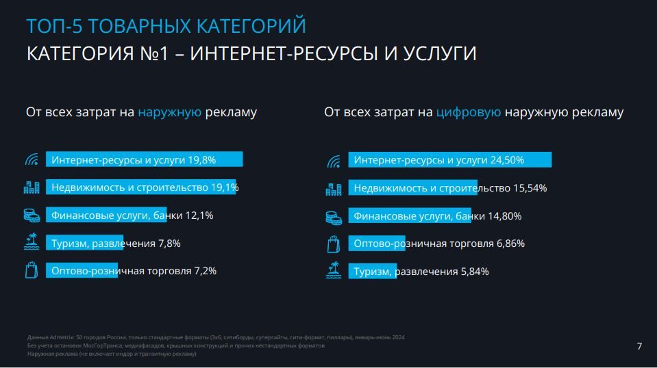 В первой пятёрке товарных категорий по доле затрат за первые шесть месяцев 2024 года — интернет-ресурсы и услуги, недвижимость и строительство, финансовые услуги и банки, туризм и развлечения, а также оптово-розничная торговля.