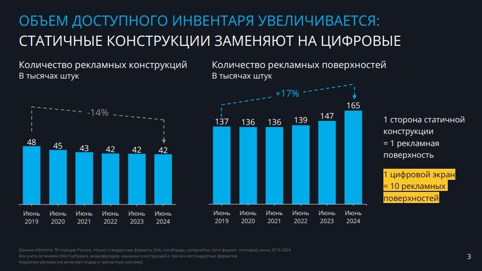 Обзор рынка наружной рекламы подготовлен на основе данных исследовательской компании Admetrix. Данные мониторинга собираются и обрабатываются ежемесячно методом визуальных инспекций рекламных конструкций стандартных форматов (щиты 3×6, ситиборды 2,7×3,7, суперсайты 4×12, 4×15, сити-формат 1,8×1,2, пиллары 3×1,4). Отчёт не включает сегменты транзитной и indoor-рекламы. Мониторинг проводится в 50 городах России.