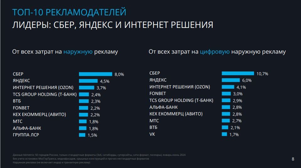 В тройку лидеров по расходам на наружную рекламу среди рекламодателей вошли «Сбер», «Яндекс» и Ozon.