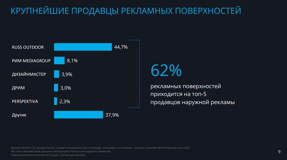 Рынок наружной рекламы продолжает консолидироваться. На пять крупнейших продавцов приходится 62% рекламных поверхностей. Среди них RUSS, «РИМ МEDIAGROUP», «ДИЗАЙНМАСТЕР», «ДРИМ» и PERSPEKTIVA. Большая часть рынка по-прежнему фрагментирована, что усиливает потребность в стандартизации.