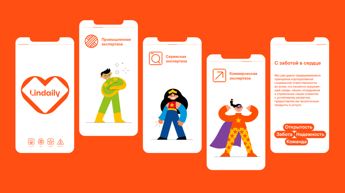 Для HR-коммуникаций мы разработали логотип, фирменные элементы и иллюстративных персонажей. Логотип представляет собой графическое изображение сердца с вписанным в него логотипом компании. Графика сердца повторяет пластику знака, а контрформа образует букву L. Также разработали серию иллюстративных персонажей: сотрудники в образе супергероев, которые каждый день «запускают цепочку заботы».
