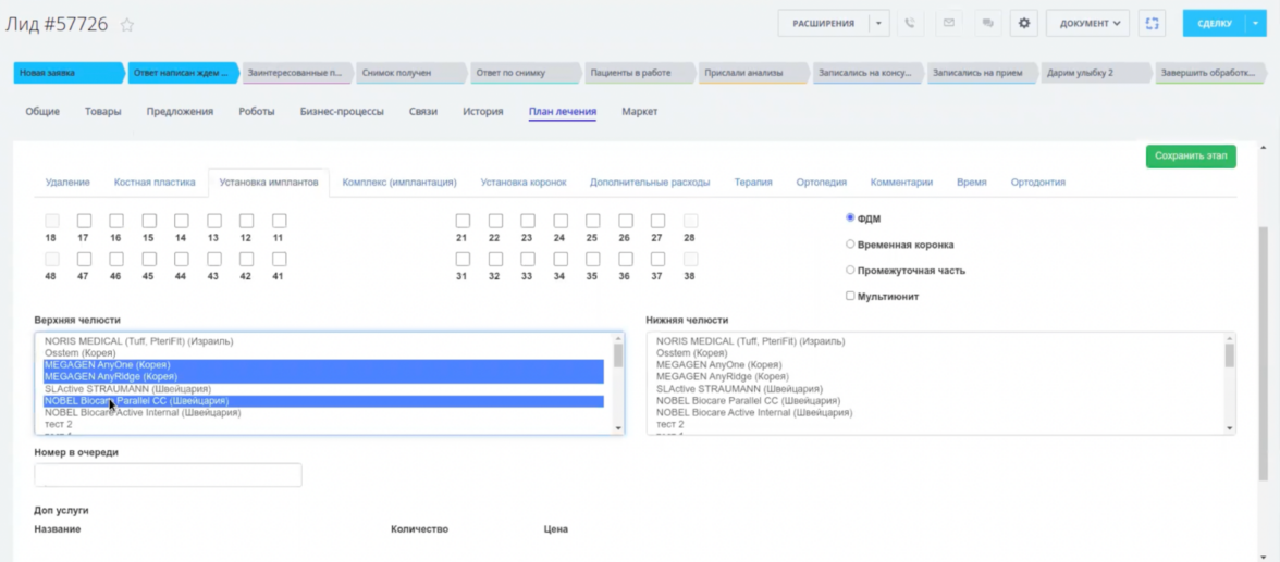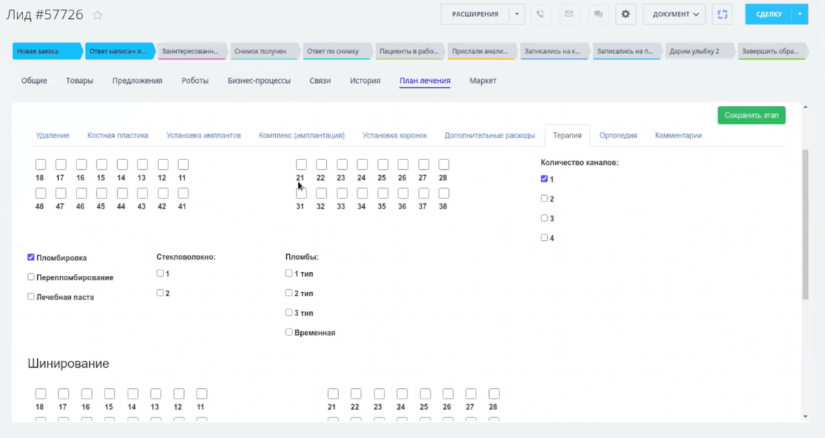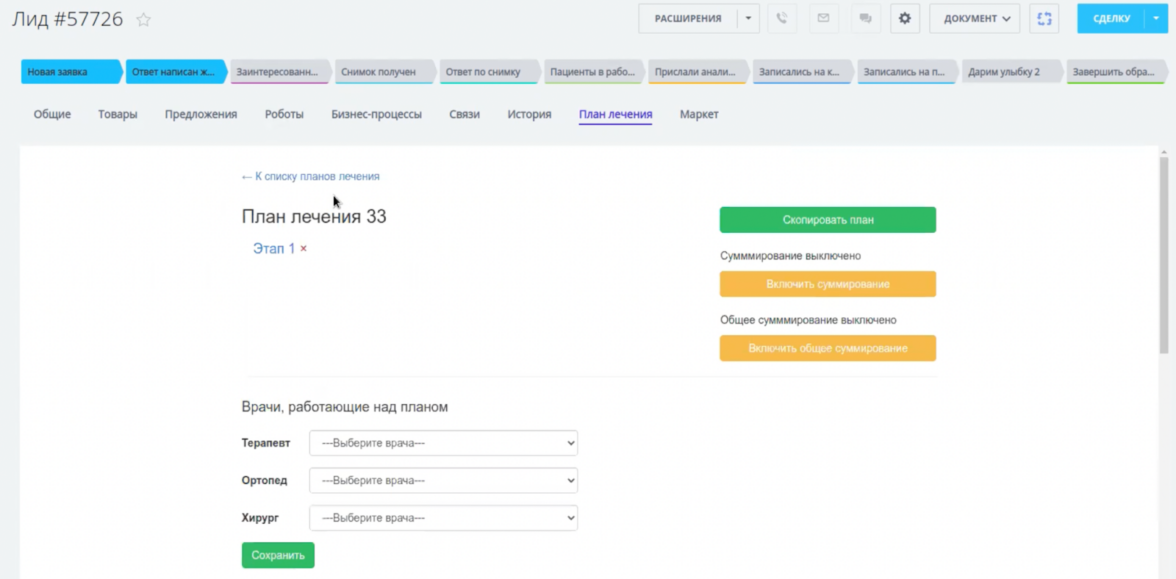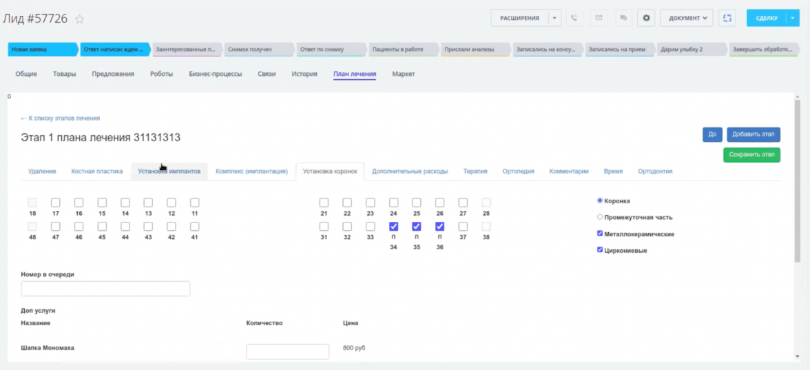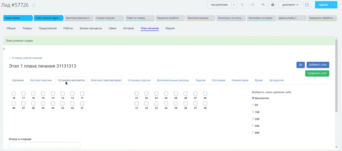 Учитывая, что некоторые процедуры не могут быть выполнены одновременно, была разработана функция разделения плана лечения на этапы. Каждая стадия сохраняется при переходе на следующий этап или при нажатии соответствующей кнопки. Готовый план можно редактировать на любом этапе. Модуль интегрирован в виде отдельной вкладки в карточке каждого лида.