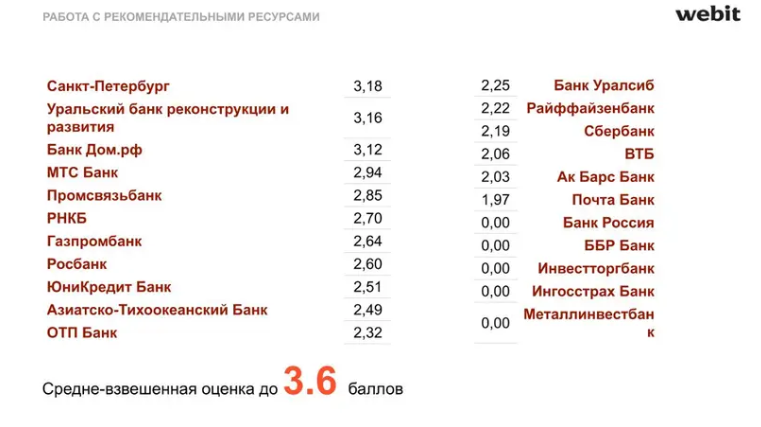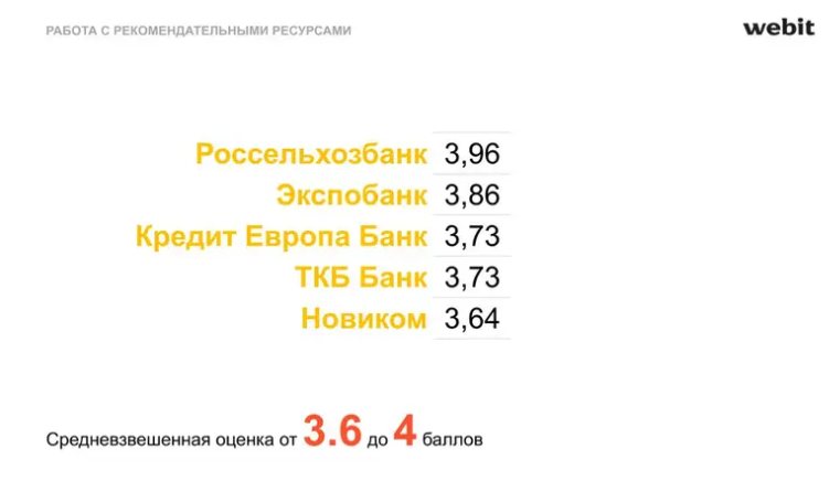 Следующим шагом стала оценка работы с рекомендательными ресурсами. Здесь оценивалась средневзвешенная оценка на шести основных отзовиках в банковском секторе: