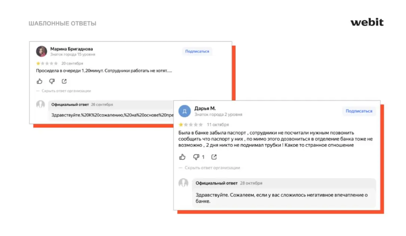 В первом случае шаблонных ответов используется автоматизация. Никто не отсматривает, что размещается. А банку даже удалось сломать верстку на Яндекс.Картах, что вообще редко встречается. Во втором примере и без ответа банка понятно, что негативное впечатление уже сложилось.