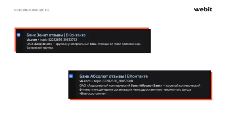 Хорошим инструмент — социальная сеть ВКонтакте. В сообществе банка можно создавать обсуждения, посвящённые отзывам, группы тоже отлично ранжируются поисковыми машинами. Ещё можно разместить пост с отзывами и под ним написать комментарии. Отдельный пост тоже может попасть в выдачу.