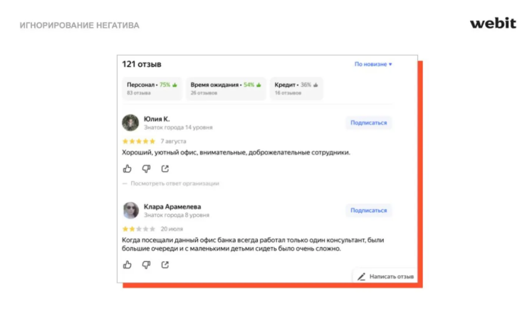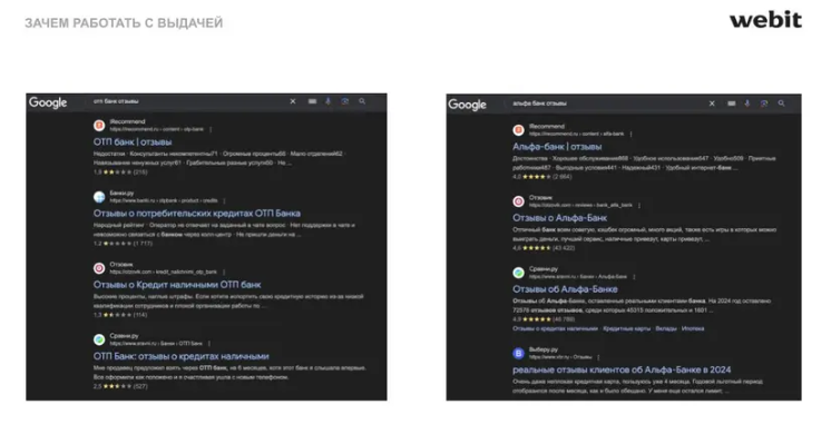 В выдачу могут подтягиваться страницы сайта, и банки показывают именно те отзывы, которые они хотят показать своему потребителю. Многие спорят, что в отзывы на официальном никто не верит и все уже знают, что они ненастоящие. В Webit считают, что лучше все-таки проработать страницы с отзывами. Как минимум, пользователи увидят поменьше негатива, возможного в ТОП-10 выдачи. Для реалистичности картины можно размещать отзывы на 3–4 балла с незначительными минусами.