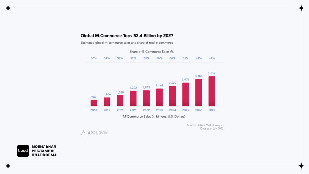 С ростом популярности мобильных приложений растет и доля мобильной коммерции. Ожидается, что в 2024 году объем m-commerce достигнет $2,52 трлн, а к 2025 году составит 62% всех онлайн-продаж.