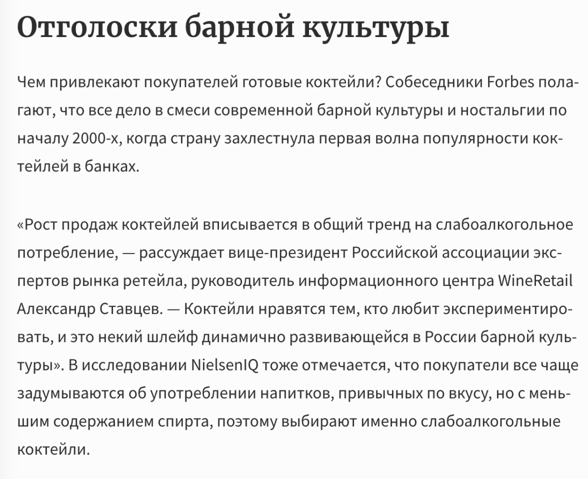 Вот недавний материал из Forbes про то, почему коктейли в банках снова стали популярны. Автор добавила мнения нескольких экспертов: на скрине — пример стандартного комментария, который получен благодаря пиарщикам