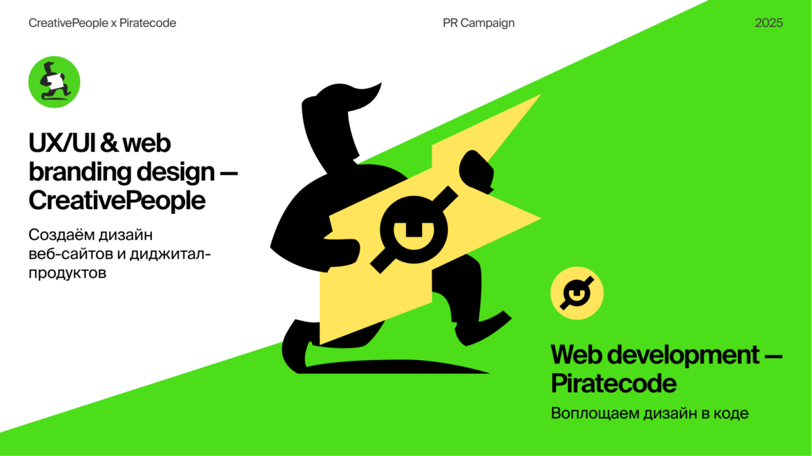 Перед нами стояла задача рассказать рынку и конкретно нашей аудитории про работу в тандеме: мы, CreativePeople, делаем крутой дизайн, а Piratecode воплощают его в коде и реализуют техническую часть проекта. И вместе мы закрываем весь пул задач по дизайну и разработке.