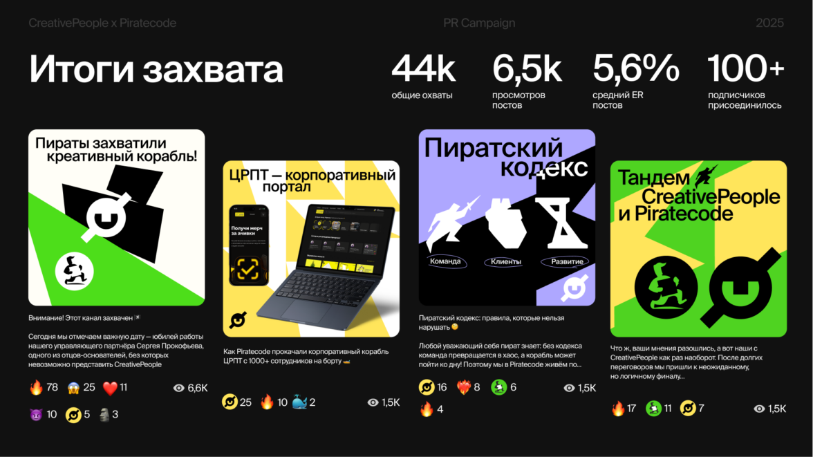 Работа в тандеме CreativePeople и Piratecode, крутые проекты (про один такой совсем скоро расскажем), возможны и новые совместные активности в соцсетях! Захват — это только начало, так что оставайтесь с нами и следите за новостями на каналах CreativePeople и Piratecode.