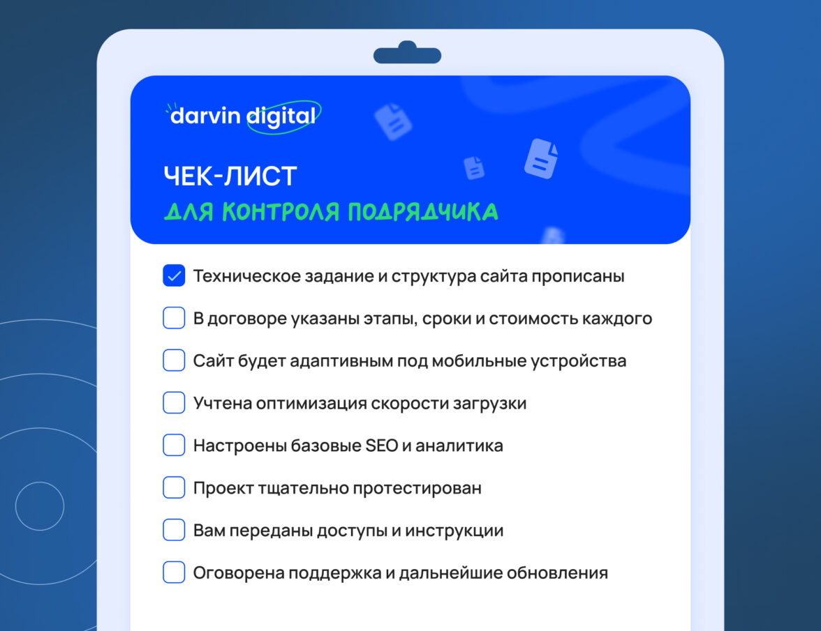 оговорена поддержка и дальнейшие обновления. Заранее выясните, будет ли подрядчик заниматься вашим сайтом после запуска. Если да, на каких условиях: почасовая оплата, помесячная услуга? Если нет — узнайте, к кому можно обратиться за поддержкой, не потеряв качество. Часто агентства предлагают пакеты сопровождения или гарантируют устранение багов, выявленных в первые дни. Мы в Darvin Digital, например, предлагаем не только создание, но и комплексное продвижение сайтов.