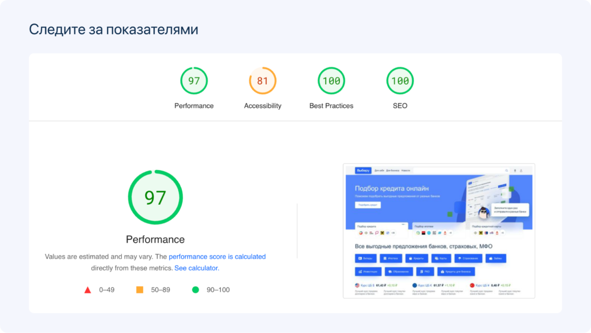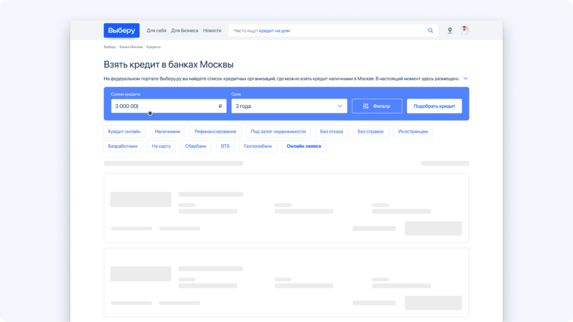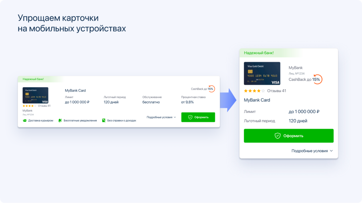 Мы применили эти правила на сайте финансового маркетплейса «Выберу.ру», чтобы облегчить листинги и карточки банковских продуктов. Несмотря на то что кредиты всегда содержат много условий, мы сгруппировали их и оставили только ту информацию, которая нужна человеку для принятия решения.