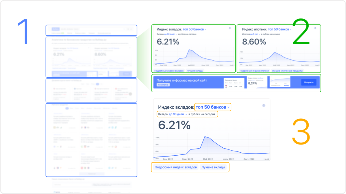 По такому принципу сделан наш раздел финансовой аналитики. На первом уровне пользователь видит, как расположена информация: заголовки первого уровня и общая структура страницы. Далее, фокусируясь на внутреннем содержании блоков, понимает — здесь есть то, что ему интересно — индексы вкладов/ипотеки. В последнюю очередь изучает детально этот блок со ссылками на более подробную информацию.