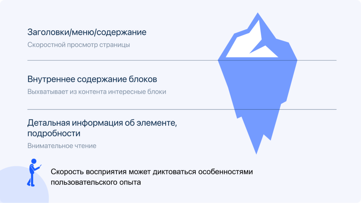 Любой макет или материал можно прочитать на трех разных скоростях. Выбор удобной, как правило, диктуется пользовательским опытом. Например, человек может заполнять форму заявки в час пик в метро или же дома за ноутбуком — скорость в этих ситуациях будет разной.