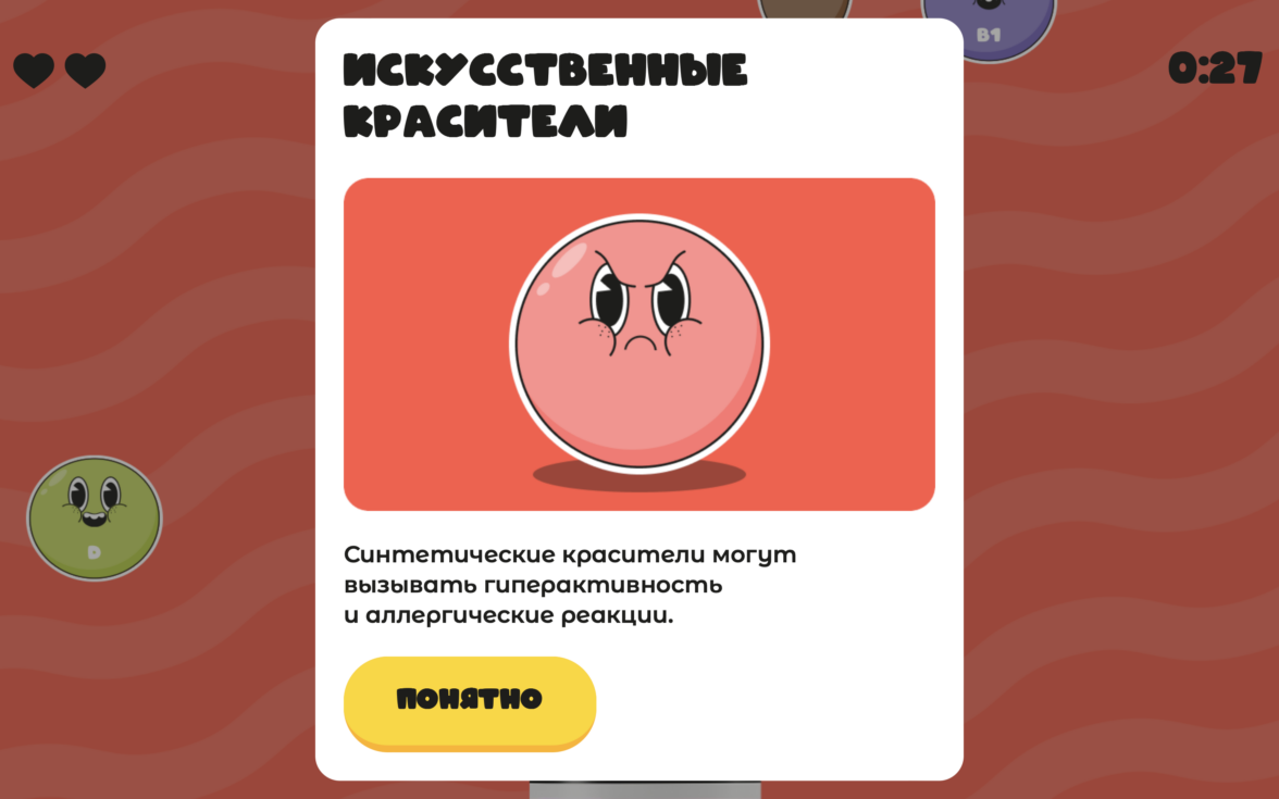 Концепция родилась достаточно быстро из просмотра игр, которые были уже нами реализованы, и подробной информации в брифе. В нём клиент делал упор на большой список полезных витаминов и отсутствие вредных элементов, которые содержатся в их напитках. Исходя из этой информации, была выбрана простая аркадная механика «поимки» в бутылку полезных элементов и избегания вредных. В игровой форме мы сразу сообщаем, из чего состоят напитки клиентов: в конце спецпроекта рассказываем о пользе одних, и в течение игры — о вреде других.