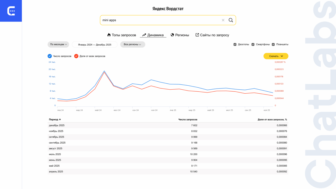 По опыту ChatLabs, с 2022–2024 наблюдается спрос на мини-приложения и решения для диджитал-проектов. Во многом на рост связан с выходом в 2024 г. игры Hamster Combat. Проект оказался вирусным, и бренды решили воспользоваться популярностью мини-приложений в мессенджерах.