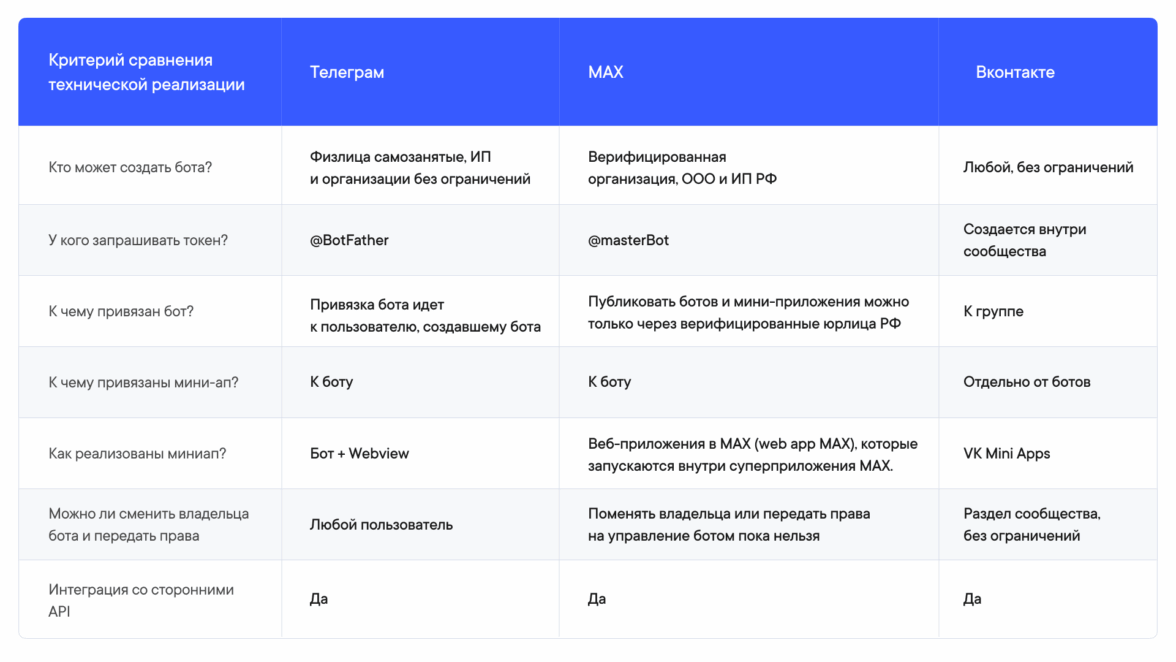 Технически разработка ботов и Mini Apps для MAX сложнее: нужно подтверждать данные юридического лица или ИП, ожидать модерацию, продумывать владельца бота (нельзя передать права). Но для пользователя получается безопаснее и удобнее. Обеспечивается соответствие законодательству (41-ФЗ), интеграция с государственными услугами и сервисами, расширенная функциональность (ИИ-ассистент, антиспам-фильтры).