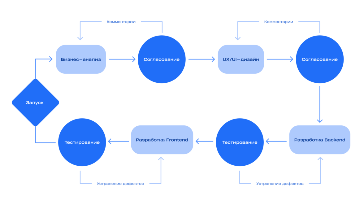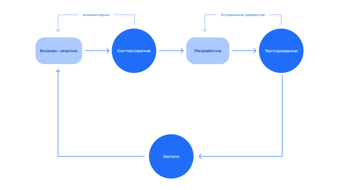 Долгие паузы во время правок и согласований увеличивают сроки разработки проекта. Ещё одна проблема — из-за большого количества участников в команде теряется контекст. Если что-то меняют в ходе разработки, например, нужна ещё одна кнопка или фильтр, эту информацию по цепочке передают всей команде от аналитика до бэкендера. В финале нужно убедиться, что все всё правильно поняли.