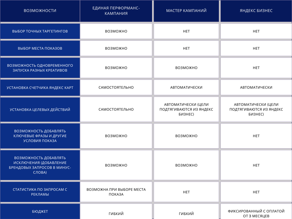 Таким образом, Единая перформанс-кампания обеспечивает максимальный контроль и гибкость, Мастер кампаний упрощает запуск рекламы без углубления в настройки, а Яндекс Бизнес подходит для малого бизнеса с ограниченными рекламными возможностями и фиксированным бюджетом.