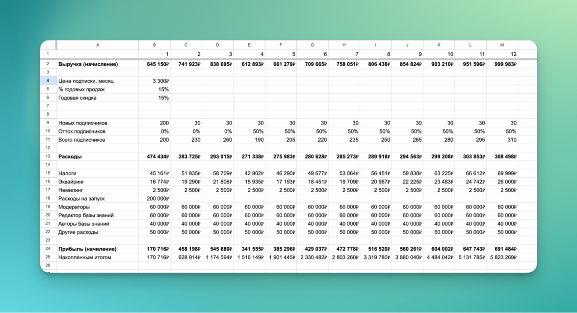 Помня ошибки прошлого, заранее составили финмодельку и покрутили ее по-всякому. Прикинули, сколько людей мы реально можем привлекать, какие у нас будут расходы, посмотрели на цены в других подписочных курсах, вывели свою идеальную цену подписки.