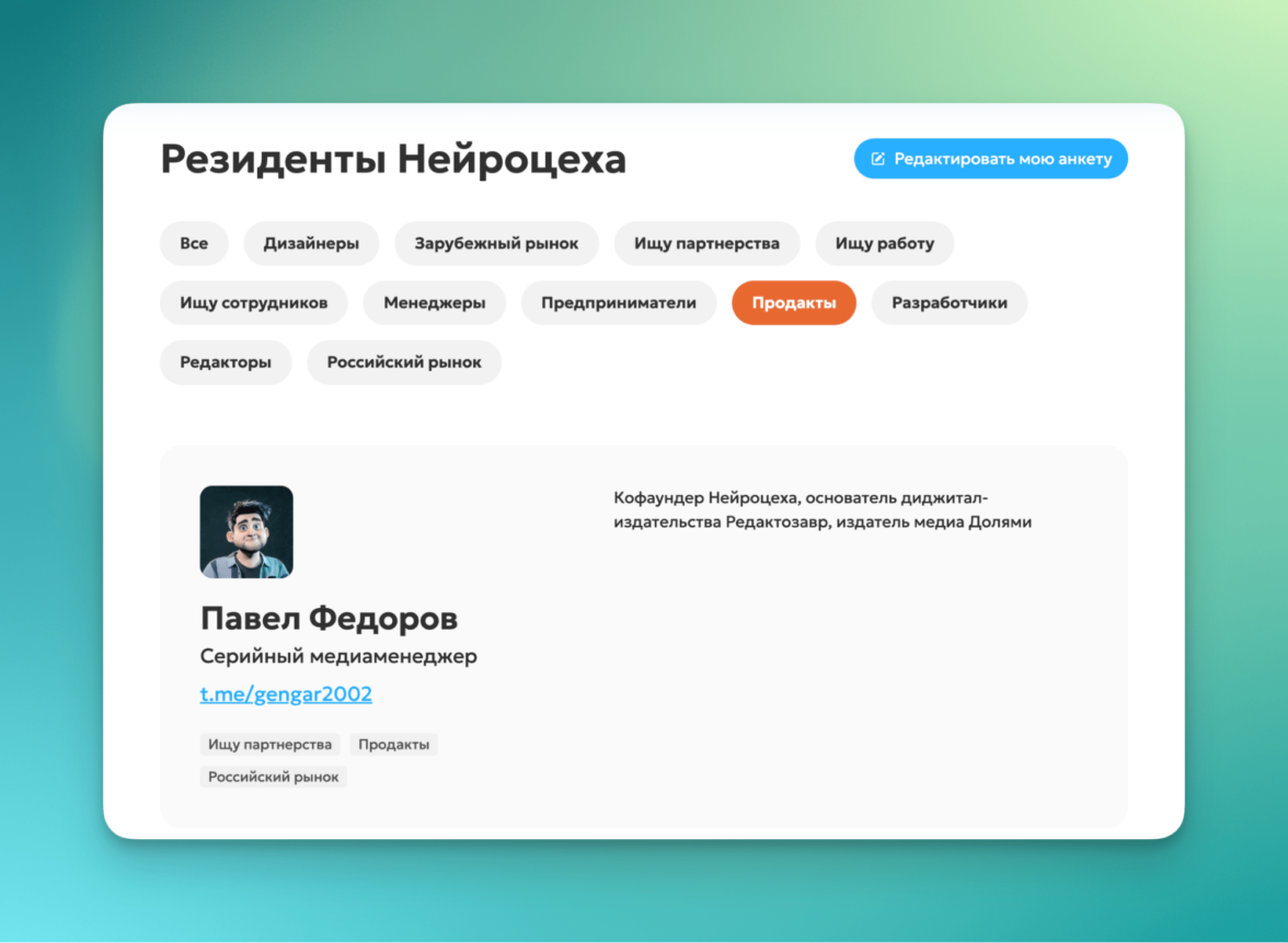 Отдельно добавили базу резидентов для нетворкинга — любой участник Нейроцеха может создать профиль на сайт, рассказать о себе, написать, по каким вопросам к нему можно обращаться. Если у человека заканчивается подписка — он пропадает из списка резидентов.