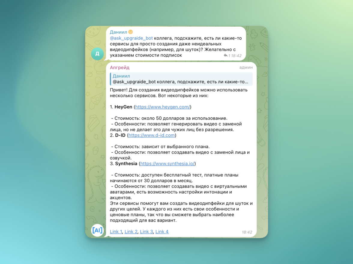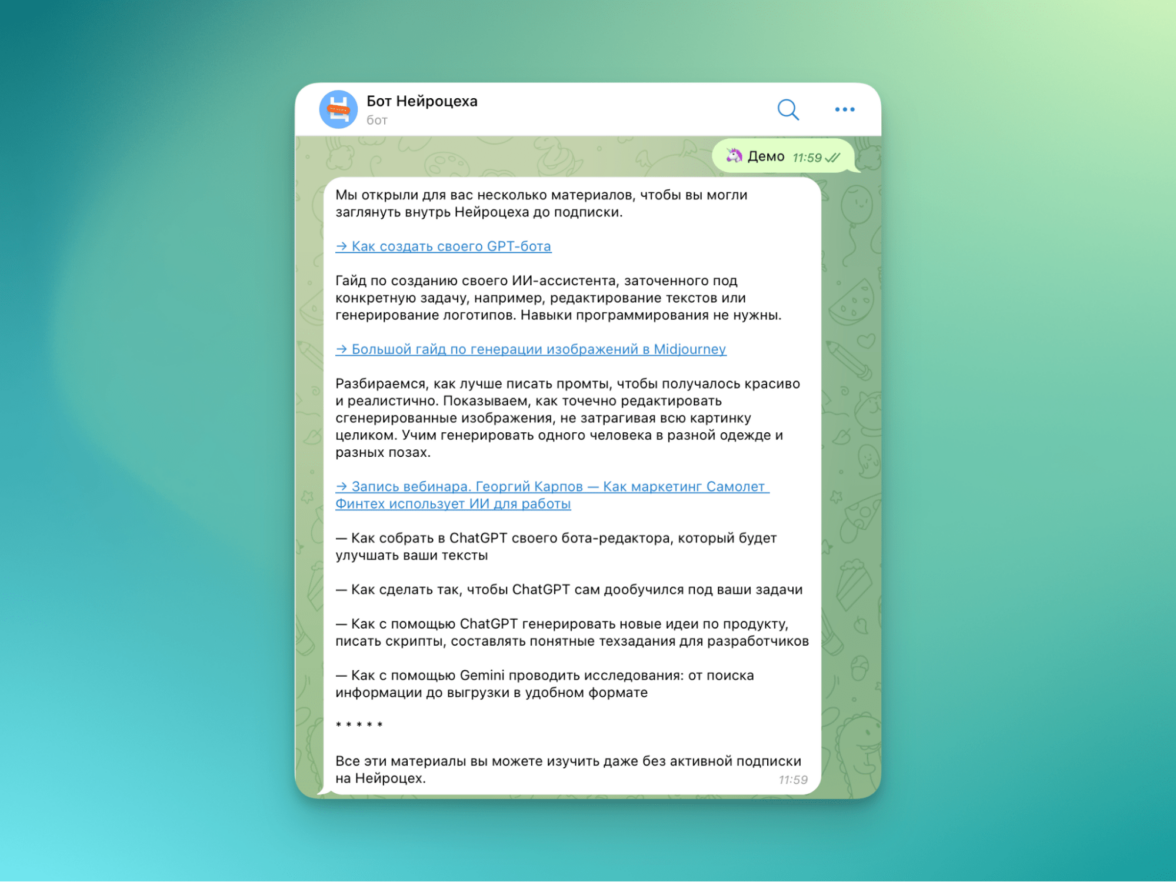 • Его можно тегнуть в чате Нейроцеха и задать ему вопрос — и он ответит на основе своих знаний.