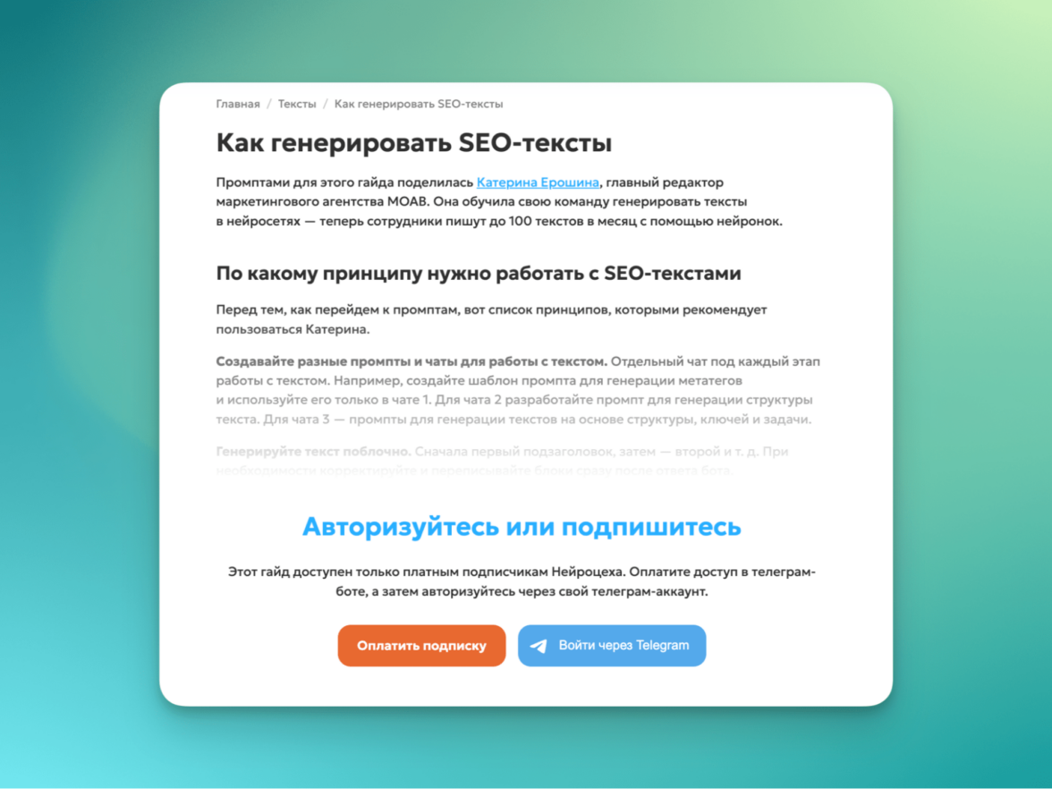 А вот так выглядит пейвол. Люди из большого интернета могут зайти в базу, посмотреть структуру, почитать анонсы вебинаров, заглянуть внутрь каждого гайда. Но чтобы что-то прочитать, надо купить подписку и авторизоваться. Можете сами полазить, посмотреть, как что у нас устроено — neurozeh.ru.