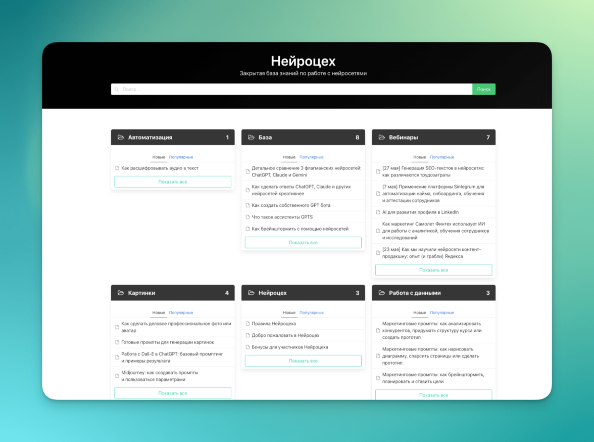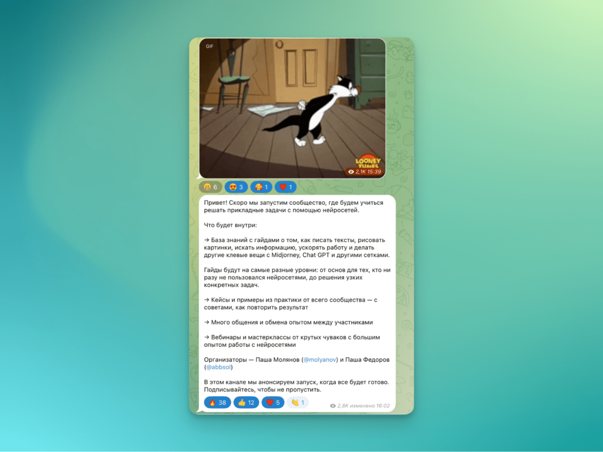 Зовем спикеров-практиков, приглашаем в гости промт-инженеров и разрабов ИИ-сервисов, ведем базу знаний с прикладными гайдами, проводим вебинары, создаем ту самую поддерживающую среду в чате, когда люди делятся кейсами, дают друг другу советы и отвечают на вопросы. Ну и поддерживаем все эту инфраструктуру.