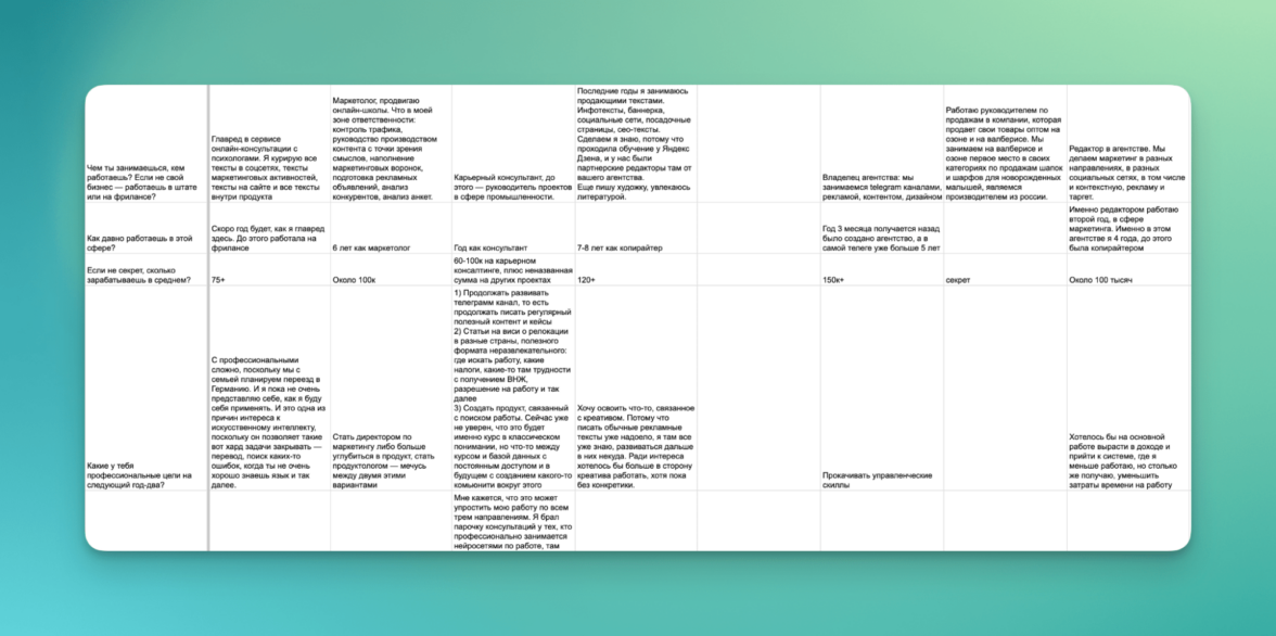 Чтобы проверить спрос на эту идею, провели серию кастдевов с разными спецами. Спрашивали, как устроена их работа сейчас, где они тратят много времени на рутину, пробовали ли они использовать нейронки, что получалось, в чем они вообще хотели бы разобраться.