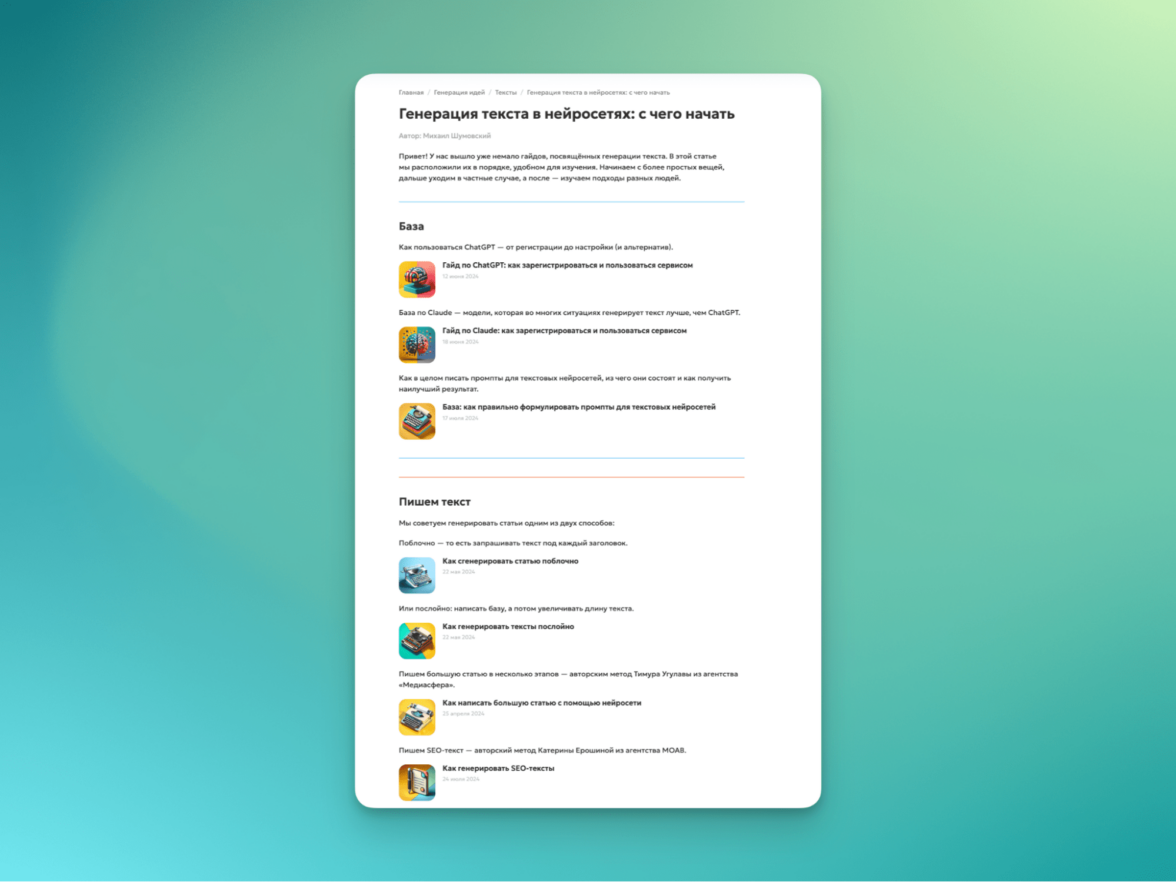 Плюс мы получили много конструктивной критики — например, что людям тяжело ориентироваться в большом количестве материалов. Стали прокачивать онбординг и сделали первый трек изучения — по генерации текстов. Трек — это как бы курс по выбранной теме, составленный из уже написанных гайдов.