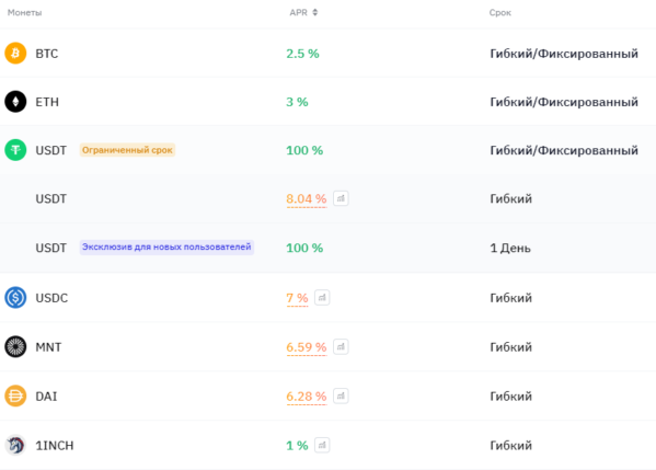 1. Bybit предлагает 8.04% годовых в USDT при плавающей ставке. 2.5% при вкладе в валюте BTC, и 3% в ETH.