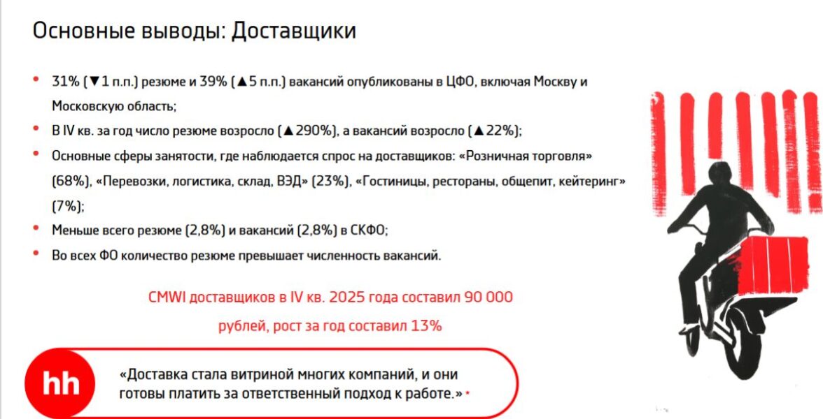 «Лидерство курьеров по темпам роста зарплат, вероятно, будет постепенно ослабевать, уступая место другим дефицитным специальностям. Хотя спрос на курьеров останется высоким, пик „зарплатной гонки» все-таки уже пройден. Рынок переходит к фазе стабилизации и оптимизации: растет доля частичной занятости (число таких вакансий выросло на треть за год), а компании начинают жестче контролировать KPI», — пояснила она.