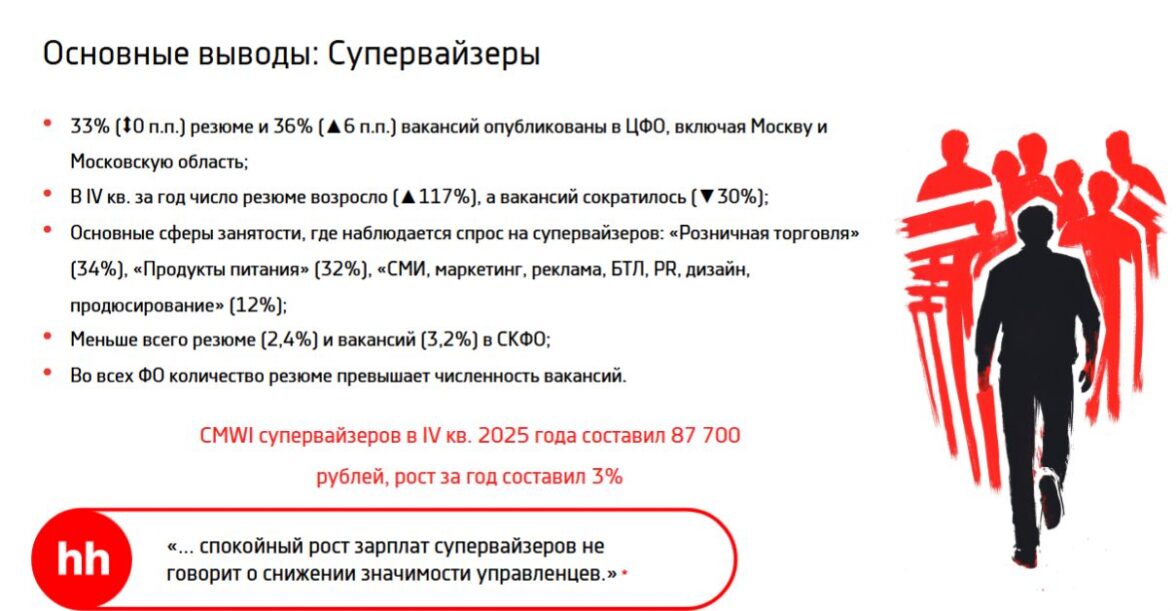 Супервайзеры сохраняют второе место в рейтинге по доходам с медианной зарплатой 87,7 тыс. рублей, но годовой рост оказался минимальным среди всех профессий — всего 3,2%. Число резюме выросло в 1,7 раза, а количество вакансий сократилось на 30%.
