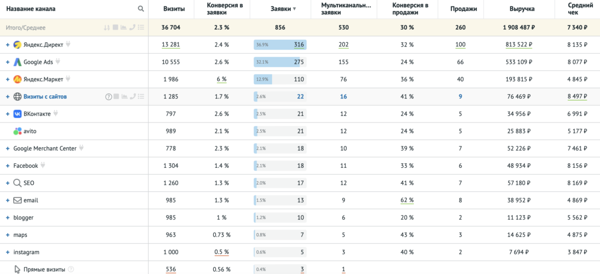 Рекламные каналы. Аналитика показывает, какой из источников окупается, а какой — сливает бюджет. Например, кампании в Директе и соцсетях принесли одинаковое количество заявок, но по второй лиды оказались нецелевыми. Чтобы не тратить деньги впустую, такой рекламный канал стоит отключить.