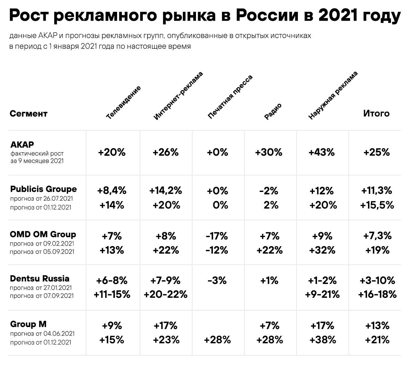 АКАР представила фактический рост за первые 9 месяцев 2021 года, и по всем показателям они превышают прогнозы Zenith и некоторых других агентств (см. материал по теме). После этих данных, GroupM также пересмотрела свой прогноз в сторону увеличения.