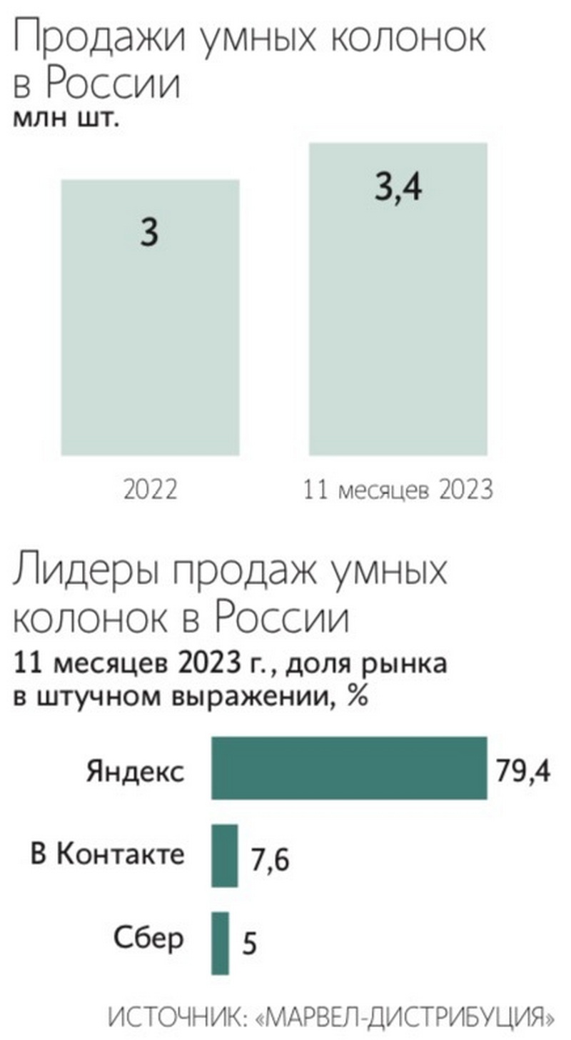 По данным компании «Марвел-Дистрибуция», безусловным лидером сегмента является компания «Яндекс». Рыночная доля «умных станции» российского технолидера в 2023 году составила 79,4% в штучном выражении. Второе место у «VK капсул» (7,65%), а третье – у умных колонок «Сбер» (5%). За одиннадцать месяцев прошлого года крупнейший российский дистрибутор электроники продал 3,4 млн умных колонок.