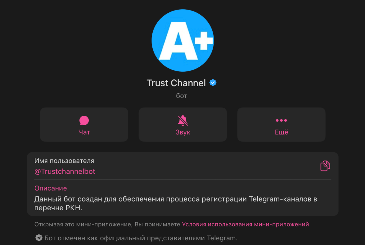 Чтобы снять операционную нагрузку и добавить удобства, в апреле 2025-го внутри самого Telegram появился бот-помощник, способный автоматически проставить «А+» в названии и прикрепить ссылку на госуслуги в описании. Теперь проверка легальности канала превращается в три простых шага:
