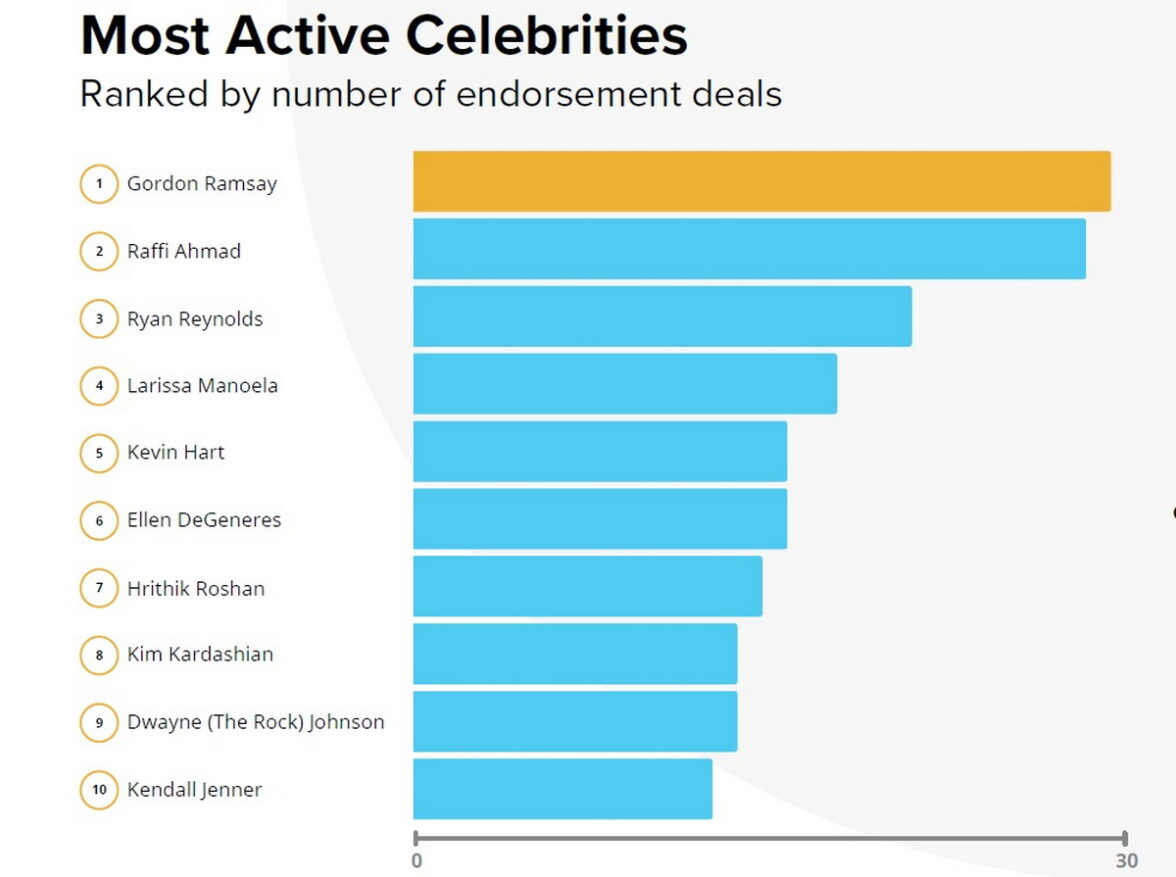 Шеф-повар, телеведущий и ресторатор Гордон Рамзи заключил 28 сделок, в том числе с Walmart, Hulu и Caesars Palace.
