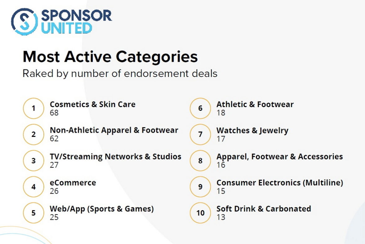 Бренды косметики и средств по уходу за кожей не первый год доминируют по числу рекламных контрактов со знаменитостями — за минувший год они заключили 65 подобных сделок. В лидеры данная категория вышла во многом благодаря компаниям L`Oreal и CeraVe, активно заключавшим крупные сделки в последние годы. Вторая по числу заключенных сделок категория — одежда и обувь (не считая спортивных), а также аксессуары — 60 сделок. В пятерку популярнейших категорий также вошли (в порядке убывания, в скобках указано число сделок): электронная коммерция (26), телевидение и стриминговое вещание (27) и спортивные приложения в интернете и соцсетях (25).