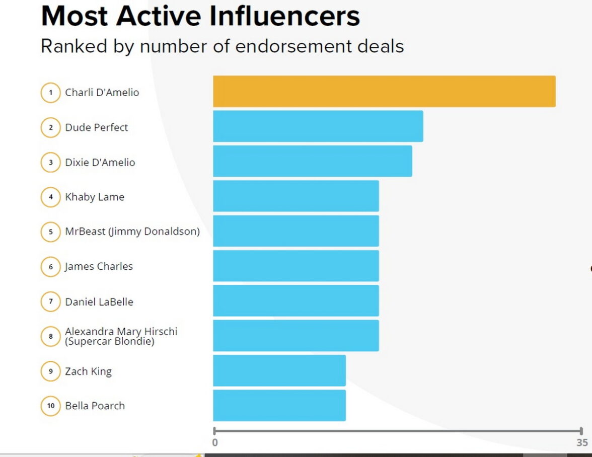 Чемпион по числу рекламных контрактов (как среди знаменитостей, так и среди инфлюенсеров) — тиктокерша Чарли Д`Амелио. На ее счету 31 сделка с брендами, включая сотрудничество с такими грандами как 7-Eleven, Walmart и L`Oreal.