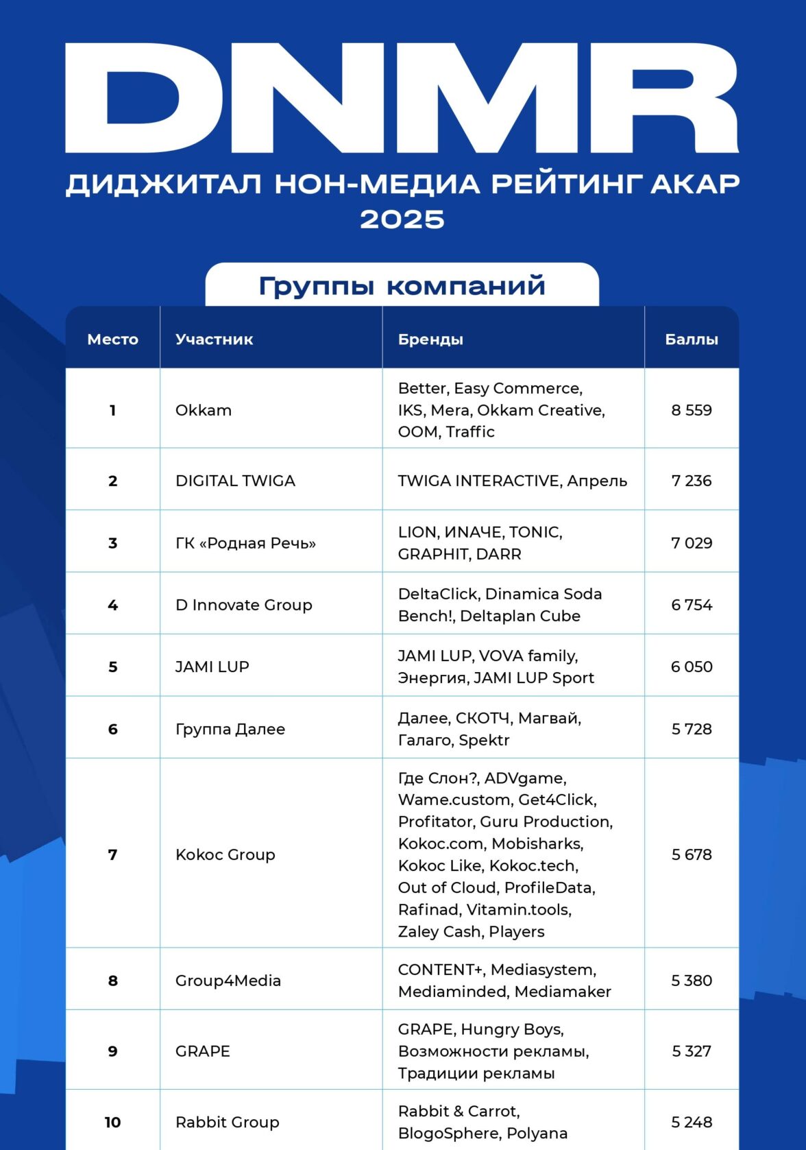 Результаты Диджитал Нон-Медиа Рейтинга (DNMR) 2025. Группы компаний