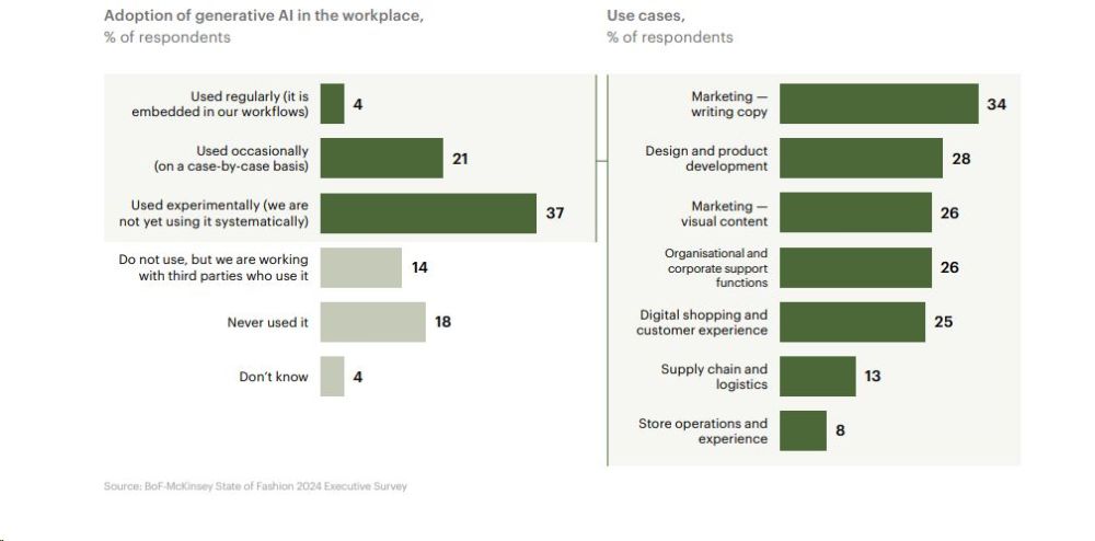 73% процента топ-менеджеров фэшн-брендов заявили, что генеративный искусственный интеллект станет приоритетом для развития бизнеса в 2024 году, но лишь 28% видят его применение в разработке коллекций и продуктов. Сейчас 40% ретейлеров экспериментируют с искусственным интеллектом. Среди сфер его применения доминирует маркетинг (60%), он также помогает разработке дизайна (28%), например, 3D-моделировании коллекций и логистике (11%) для оптимизации цепочек поставок. При этом в компаниях заявляют, что ИИ в обозримом будущем не заменит людей, которые будут необходимы хотя бы для того, чтобы управлять новыми технологиями.