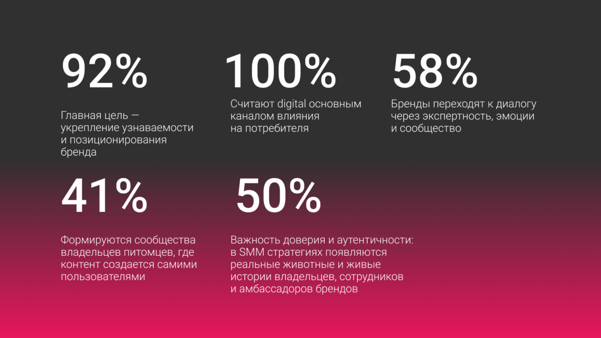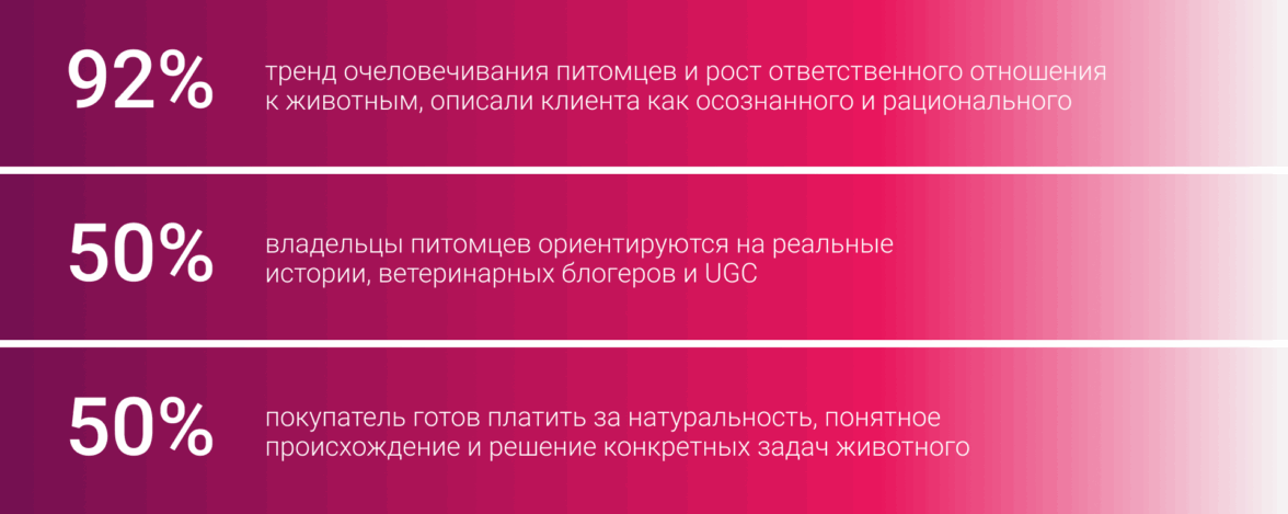 Контент-маркетинг и комьюнити. Бренды создают чаты с онлайн-ветеринарами, поощряют UGC, формируют живую среду общения. Растет запрос на slow content — материалы, дающие реальные знания о составе и пользе продуктов.