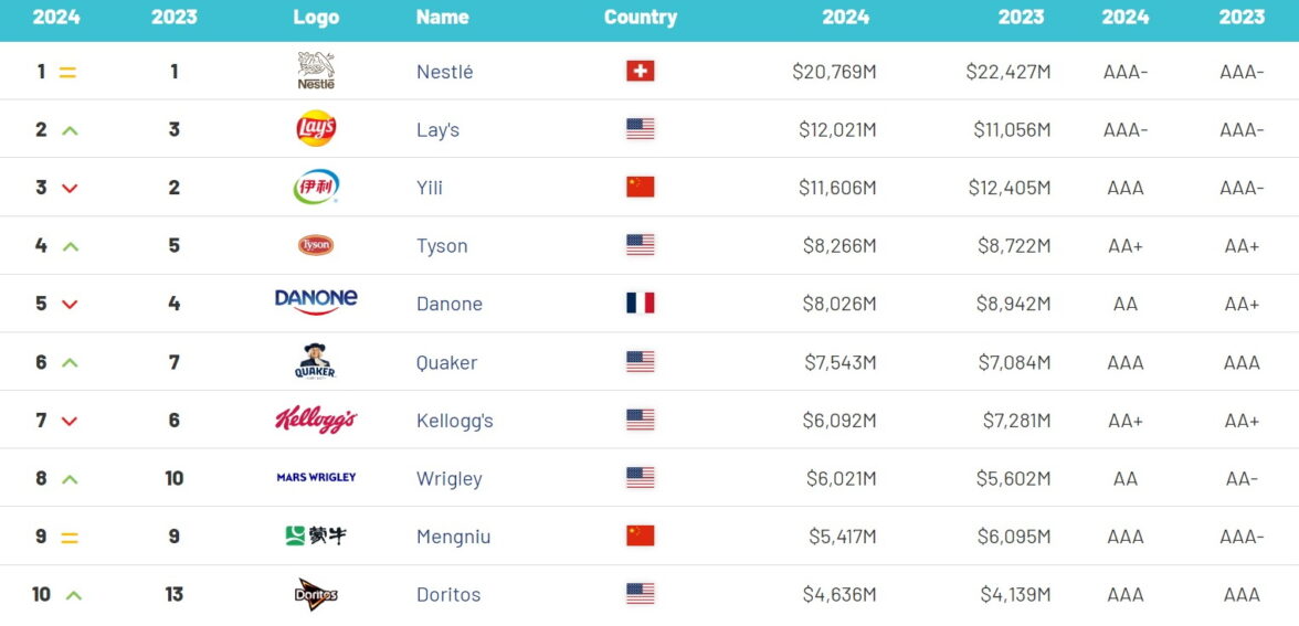 По сравнению с прошлым годом похожим образом поменялись местами американский Tyson (свежие и замороженные продукты из куриного мяса, в этом году 4-е место, $8,3 млрд) и французский бренд йогуртов Danone (в этом году 5-е место, $8 млрд). Два следующих американских бренда также за год поменялись местами. Бренд овсяных хлопьев Quaker с седьмого поднялся на шестое (сейчас он оценивается в $7,5 млрд). Бренд сухих завтраков Kellogg`s с шестого опустился на седьмое (и стоит сейчас $6,1 млрд). В первую десятку также вошли следующие бренды (в порядке убывания): Wrigley (жевательная резинка, $6 млрд), Mengniu (главный конкурент Yili на китайском молочном рынке, $5,4 млрд) и бренд чипсов из тортильи Doritos ($4,6 млрд). Все бренды, занимающие места с шестое по десятое, кроме Mengniu — американские.