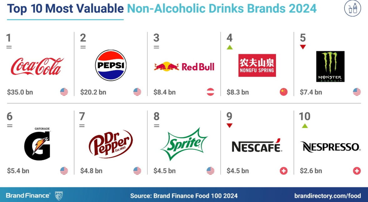 Вечно вторая Pepsi оценивается в этом году в $20,2 млрд. На третьем месте — австрийский энергетик Red Bull ($8,4 млрд). Ему лишь незначительно уступает в стоимости китайский бренд Nongfu Spring (минеральная вода и другие безалкогольные напитки, $8,3 млрд). На пятом месте — американский энергетик Monster ($7,4 млрд).